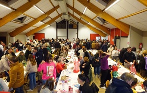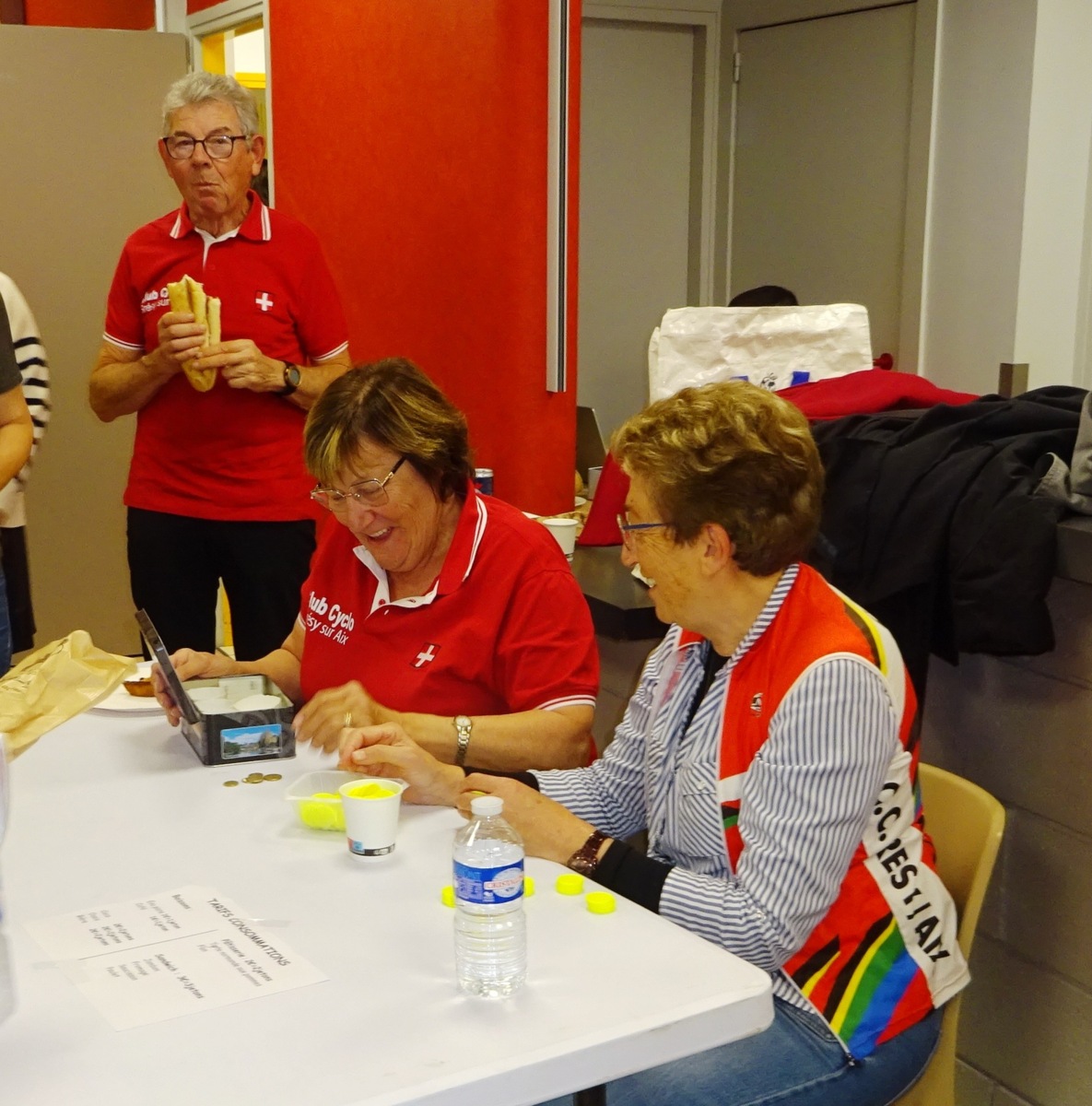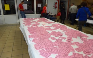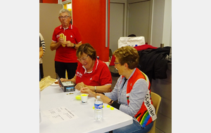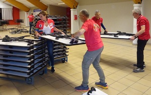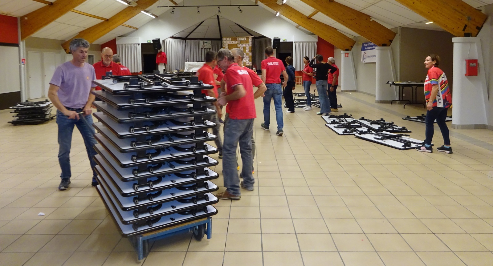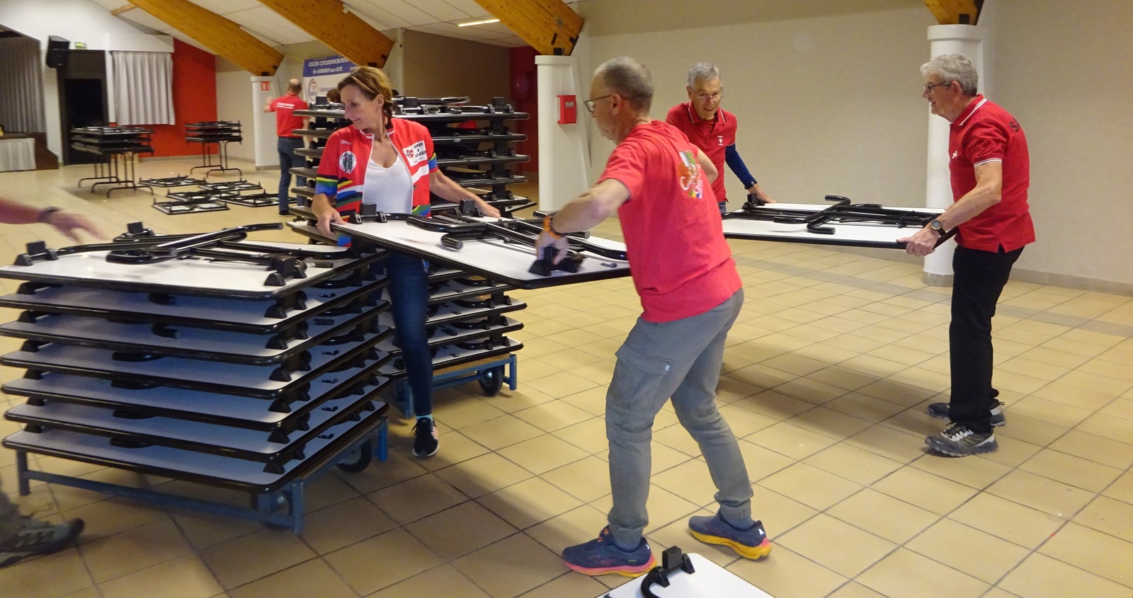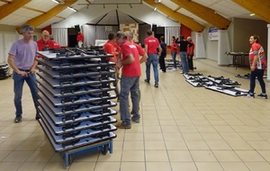Tou-te-s les bénévoles étaient sur le pont dès le matin aussi bien pour préparer les sandwichs ( merci Mesdames ) que pour installer les tables, les nappes, les chaises, l'estrade avec le tableau des tirages. Les réservations étaient très nombreuses ( plus de 75 % des places ) et le président C. Michaud a su les gérer de main de maître. Chacun savait ce qu'il avait à faire grâce à une organisation très bien préparée.